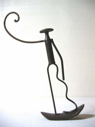 Equilibre poétique - Fer et aciers forgé - h48 cm« Quand je sculpte je vois apparaître des formes dans le métal comme dans les nuages, là où en apparence il n’y avait rien. Je me laisser porter par la découverte, dans un jeu entre réminiscences et évocations, dans une pérégrination aux détours inattendus dont je peux ramener quelque chose à montrer. Un voyage dans lequel je redécouvre des sentiments oubliés, un geste, un visage, un instant d’enfance… J’aime l’expression du mouvement, l’émotion de la danse, les figures totémiques, tout ce qui nous touche et ne peut se dire avec des mots. J’aimerais pouvoir retrouver des symboles enfouis qui évoquent la place de l’homme dans l’univers. Je vois le fer comme un métal noble et magnétique, celui qui se trouve au centre de la terre. Je le récupère partout, dans les bois, les ruisseaux, les fossés, et j’aime ses couleurs, celles qu’il prend sous l’action des éléments, battu par la pluie, enfoui sous la terre, brûlé par le soleil et le feu... quand je le transforme je me sens en harmonie. » BIOGRAPHIE Shahn, Né à Genève en 1965 1980 - 1985 Maturité Fédérale Artistique Restaurateur d'Objets d'Art EXPOSITIONS 1999 - Exposition « La Salle de Garde », La Roque sur Cèze, Gard, France. 2001 - Exposition « Cour intérieure », L’Isle sur la Sorgue, Vaucluse, France. 2002 - Exposition « Cour intérieure », L’Isle sur la Sorgue, Vaucluse, France. 2003 - Exposition « Cour intérieure », L’Isle sur la Sorgue, Vaucluse, France. 2004 - Exposition « Château de St Victor sur Loire», Rhône-Alpes, France. 2005 - Exposition « Galerie Ruine », Genève. 2006 - Exposition « Galerie Chausse-Coq », Genève. 2007 - Exposition « Galerie En Beau Regard », Montreux. 2007 - Exposition « Galerie Chausse-Coq », Genève. 2012 - Exposition « Nest Galery », Genève. 2012 - Exposition « Galerie Yolenn White », Genève. « Equilibres poétique » Instants suspendus, échos et mouvements La lune écarlate éclaire la berge Les échos de mon rêve se dispersent Et un vieil homme sourit. Trois fois rien pour tout ce qui compte L’amour au coin de la rue Un oiseau moqueur qui déraille Les enfants se baignent à la fontaine. Le soleil sera-t-il de la partie Tous les regards que l’on croise Une belle femme à l’air triste La brume épaisse sur le pays. Abstractions lyriques et poèmes noctambules Alertes ! Amour Danses sacrées, pieds nus, et l'arbre de vie Mystères aux couleurs chatoyantes. |